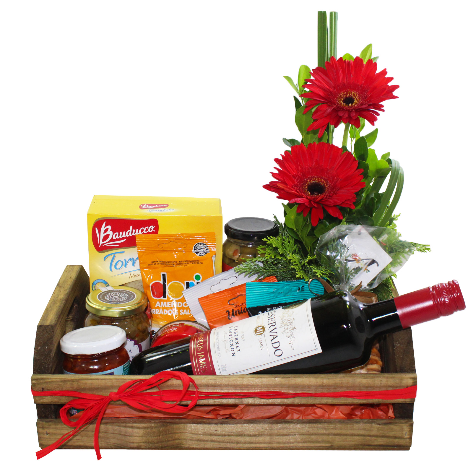 Caixote de madeira embalado em papel celofane contendo: