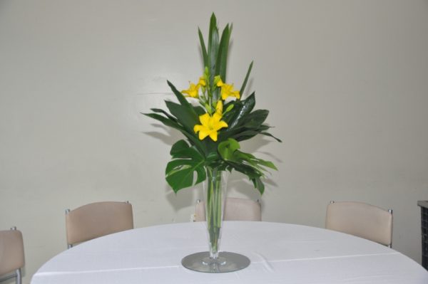 Arranjo alto para centro de mesa de folhagens e lírios