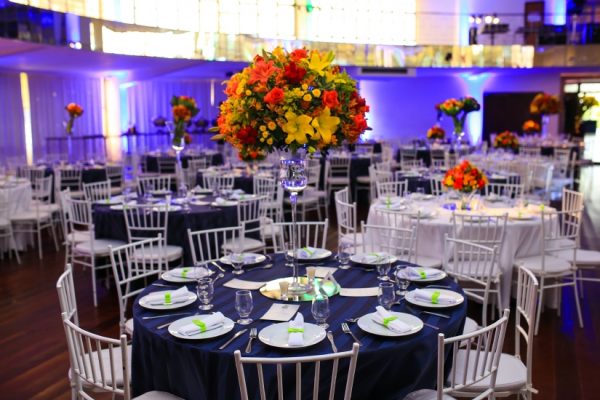Arranjo de rosas, lírios e alstroemérias em vidro alto para centro de mesa