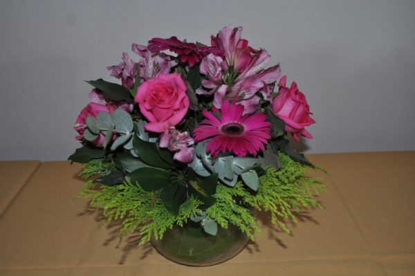 Arranjo para centro de mesa de rosas, gérberas e alstroemérias em base de vidro