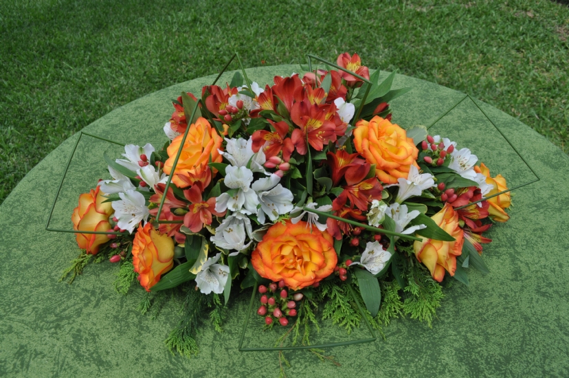 Arranjo para mesa diretiva de rosas, alstroemérias e hipericum