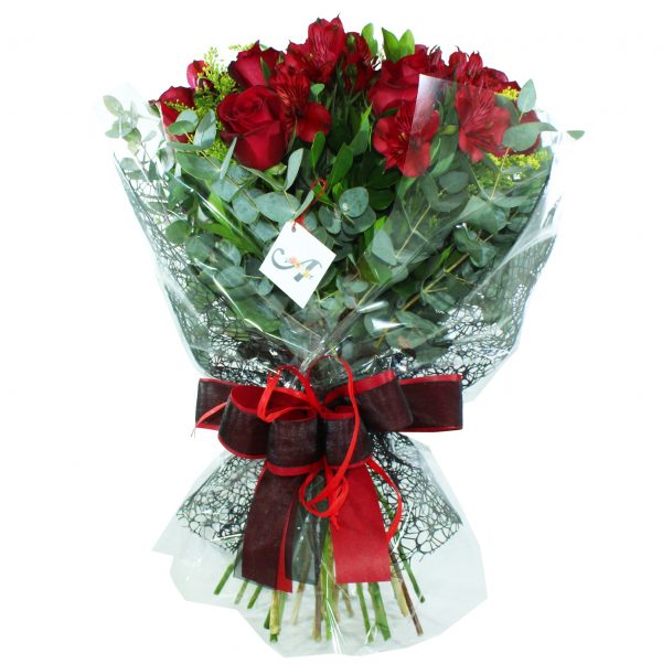 Buquê de 10 rosas e alstroemérias vermelhas embalado em papel celofane e tela preta